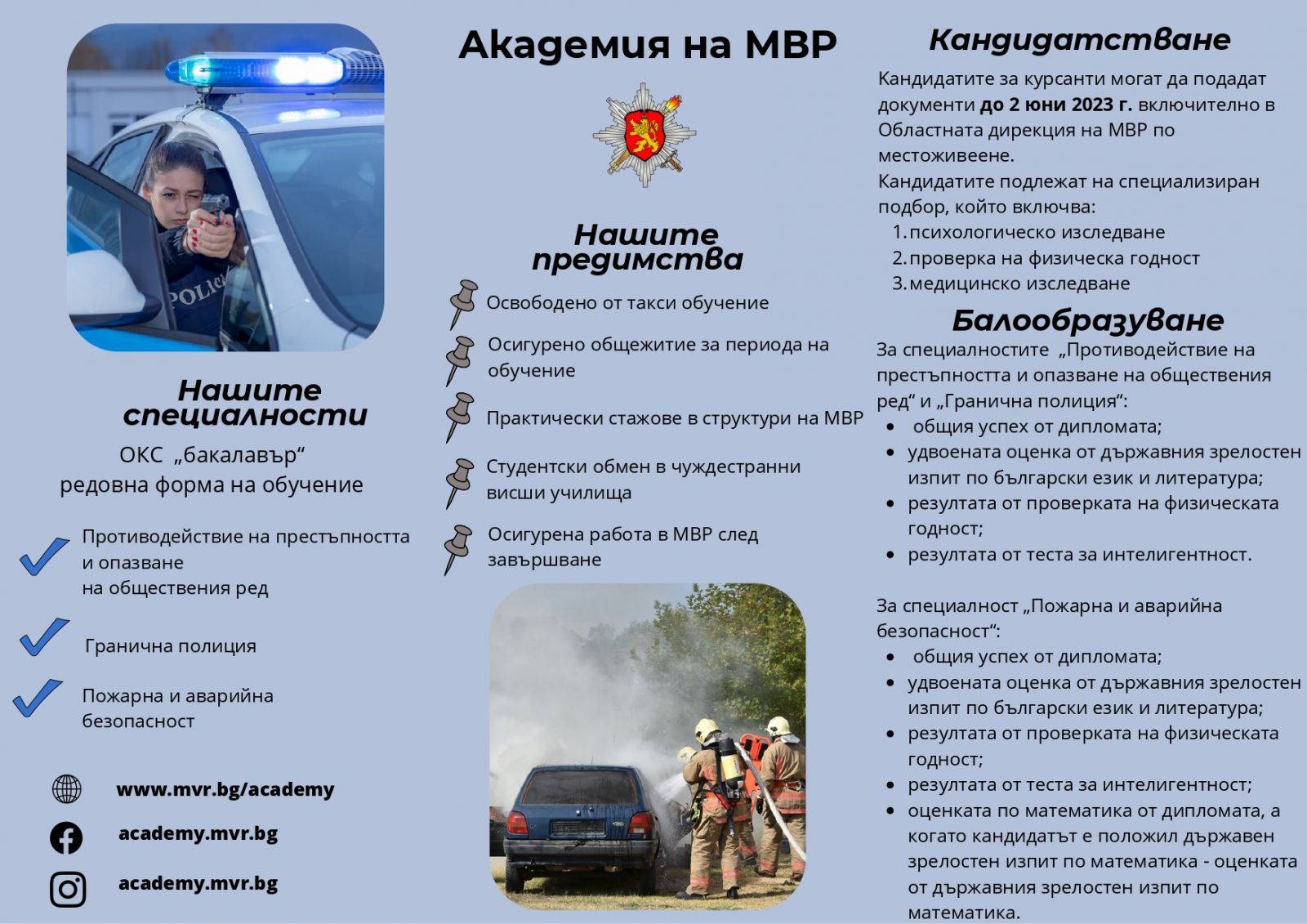 И тази година специалностите за образователно-квалификационна степен „бакалавър“ в двата факултета на висшето училище са: „Противодействие на престъпността и опазване на обществения ред“, „Гранична полиция“ и „Пожарна и аварийна безопасност“.